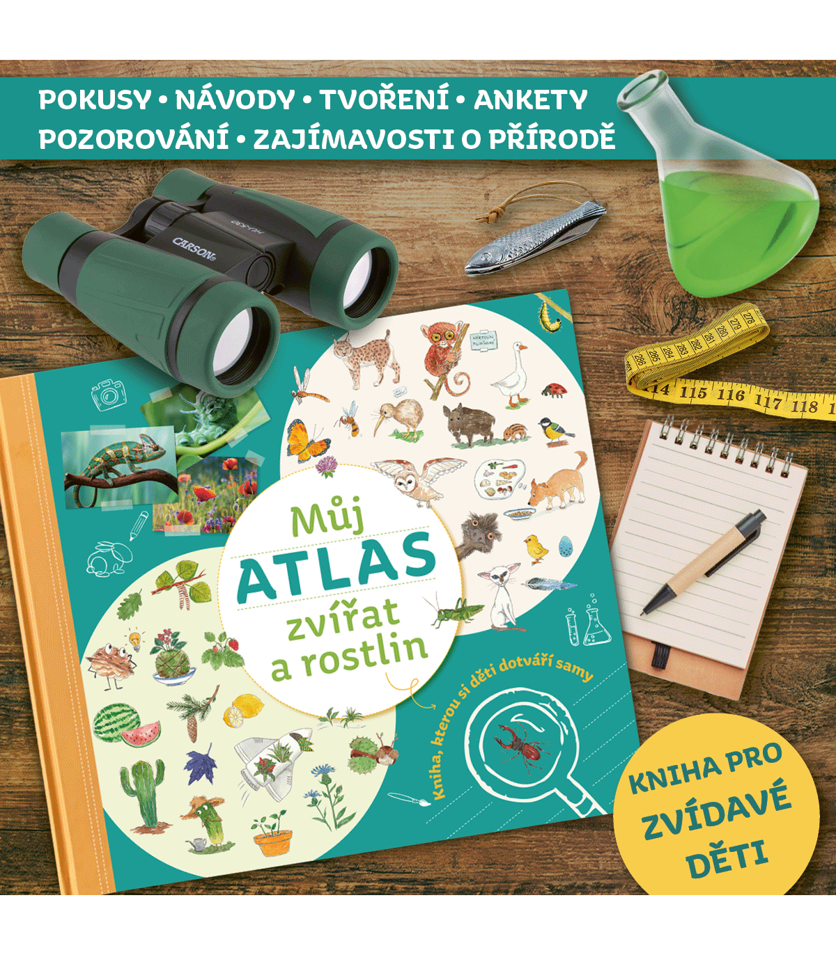 Můj atlas zvířat a rostlin je kniha, kterou si malí dobrodruzi tvoří sami. Děti se hravou formou učí pozorovat přírodu kolem sebe a zapisovat své zážitky a poznatky do této interaktivní knihy. Tato kniha je plná fascinujících informací o ptácích, motýlech, včelách, stromech, květinách a dokonce i domácích zvířatech. Kromě toho nabízí zábavné úkoly, jako jsou: