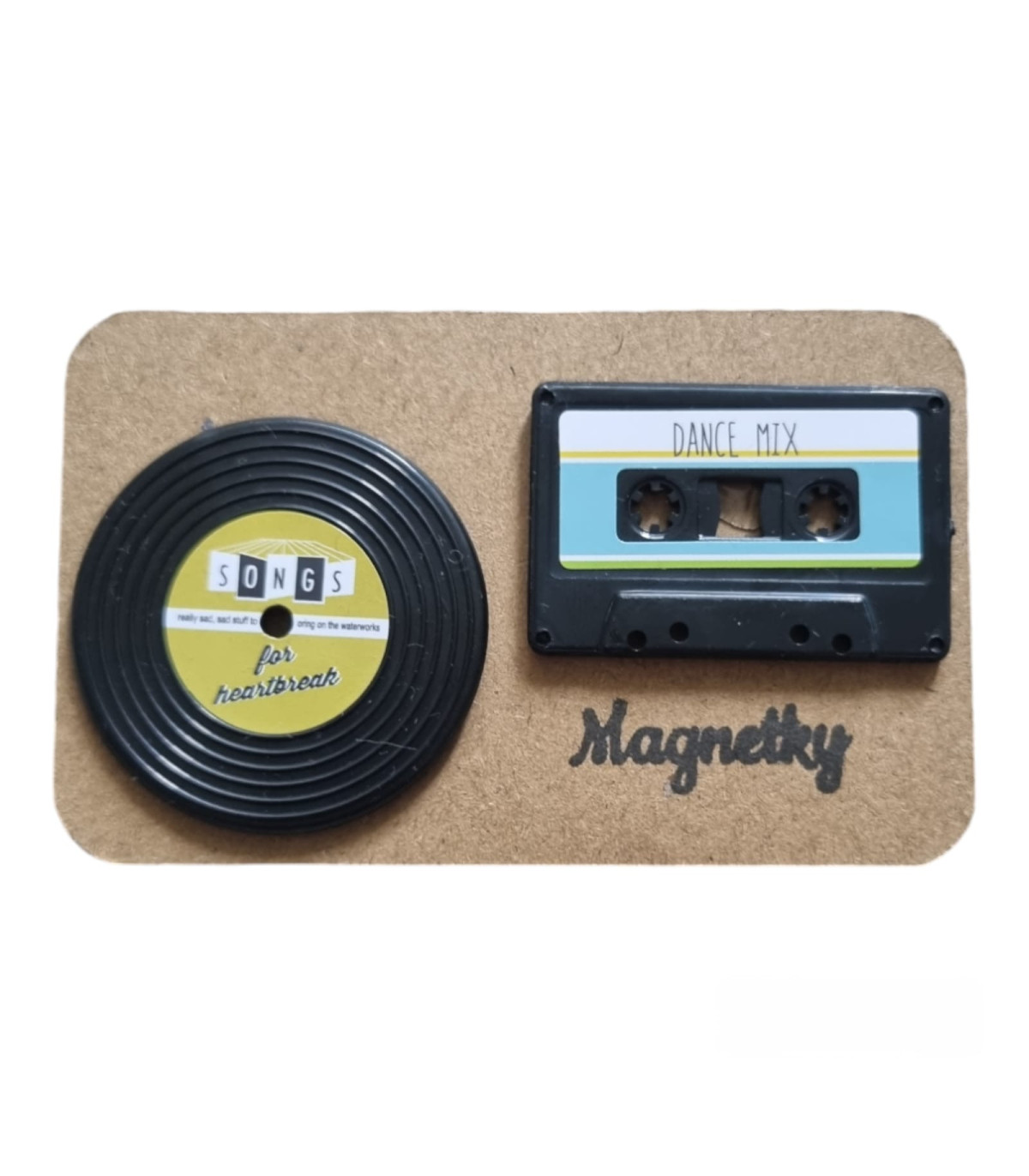 Magnetky: 1x LP, 1x audio kazeta na kraftovém papíru, rozměry kazety 4,2 x 3cm, LP desky 4,2 x 4,2 cm, materiál plast ABS