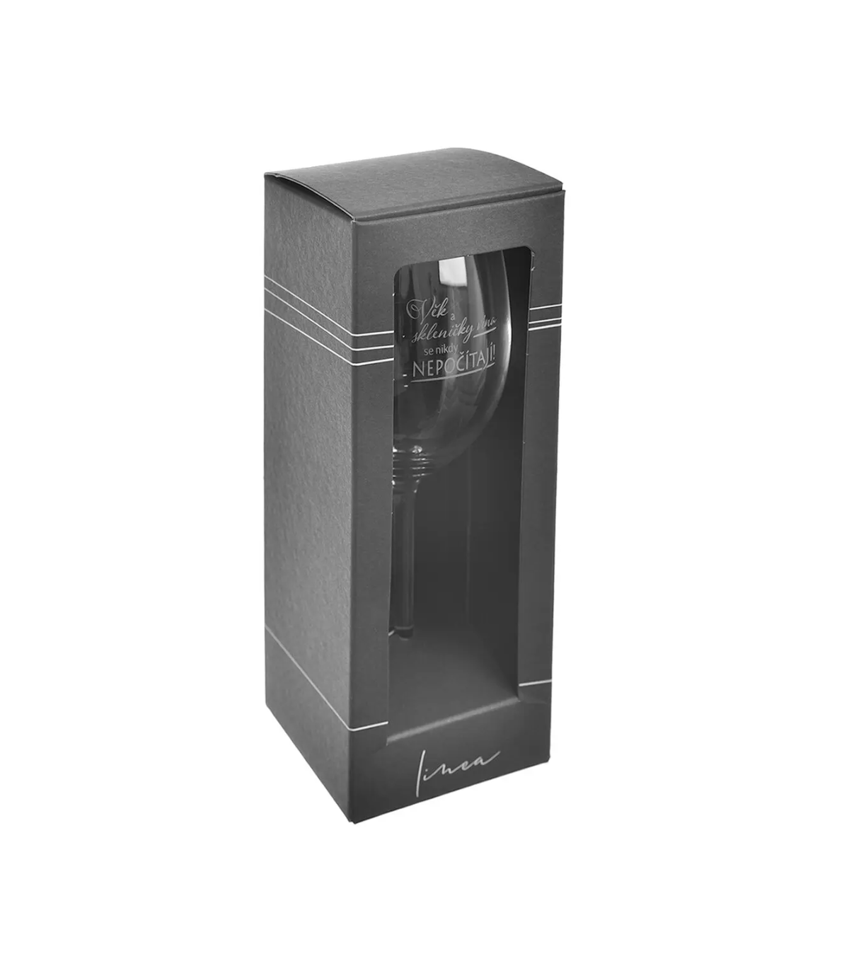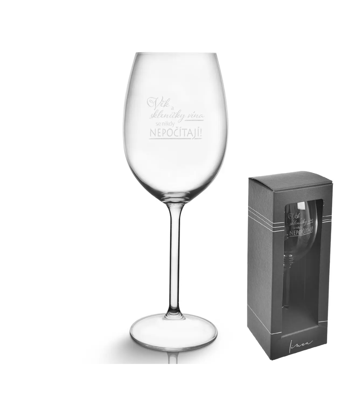 Představujeme dokonalý dárek pro každého, kdo si rád užívá života s humorem - sklenice na víno s nápisem "Věk a skleničky vína se nikdy nepočítají".
