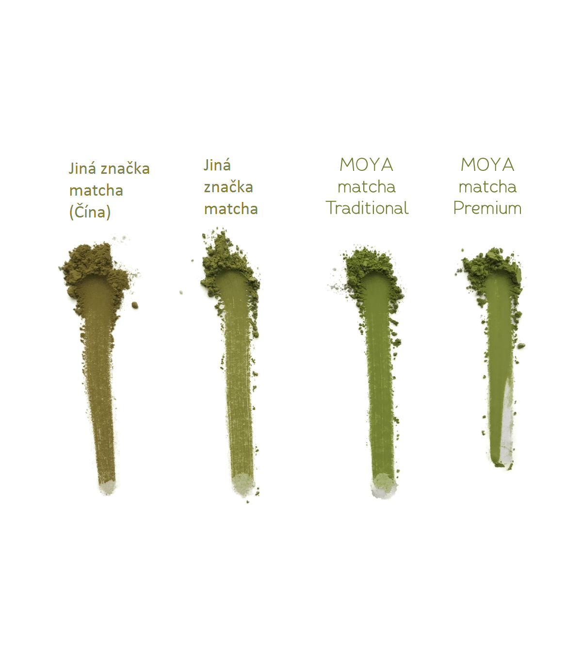 BIO Moya Matcha TRADITIONAL se získává z 1. a 2. sklizně z čajových rostlin, které jsou speciálně zastíněné před přímým slunečním zářením. Výsledkem je vyšší obsah chlorofylu a L-Theaninu a bohatší, zelenější barva. Čerstvé listy se potom seberou, suší a rozemelou na prášek.