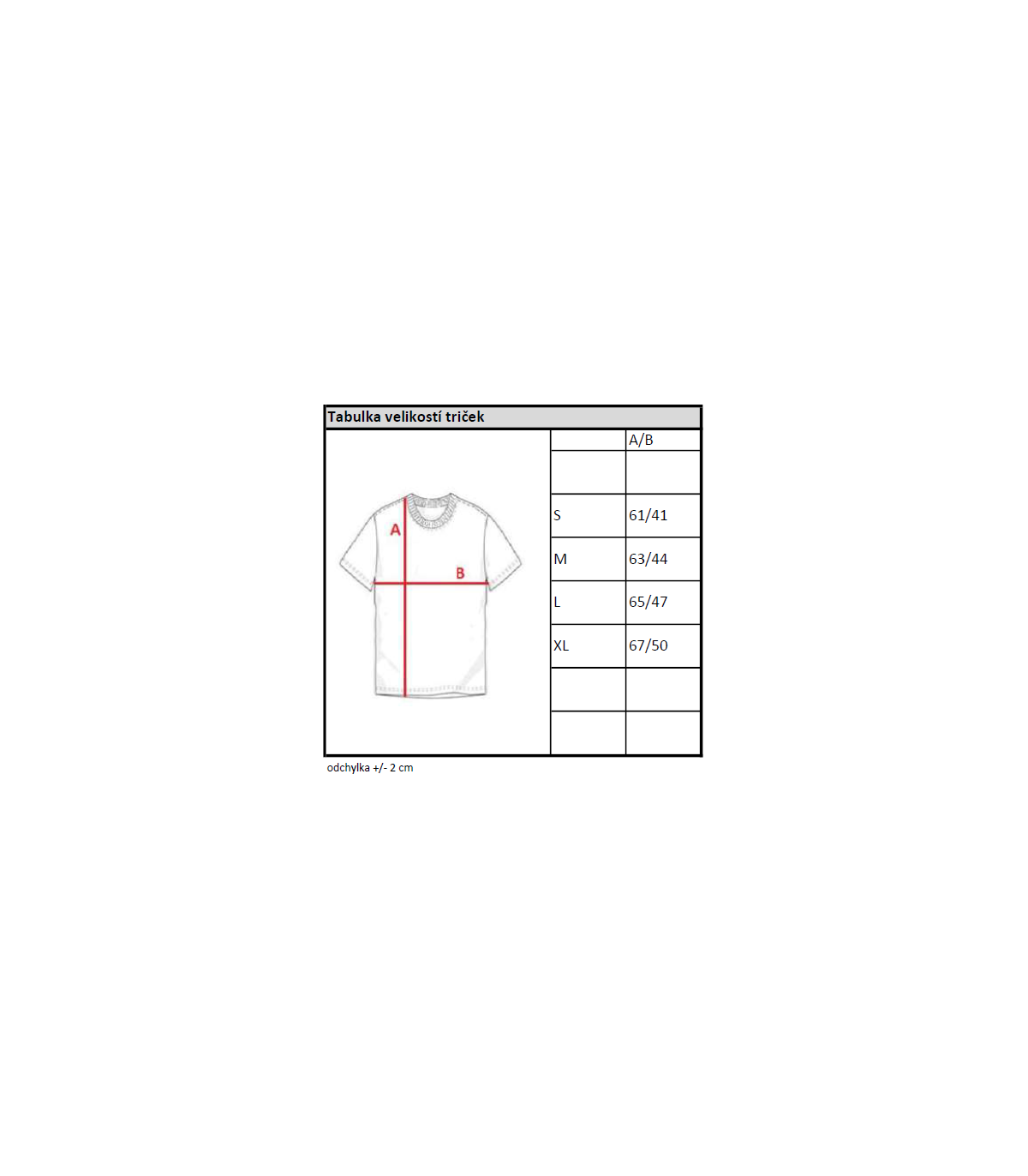 Tričko je vyrobeno ze 100% bavlny, 150g, bílé s černým potiskem.