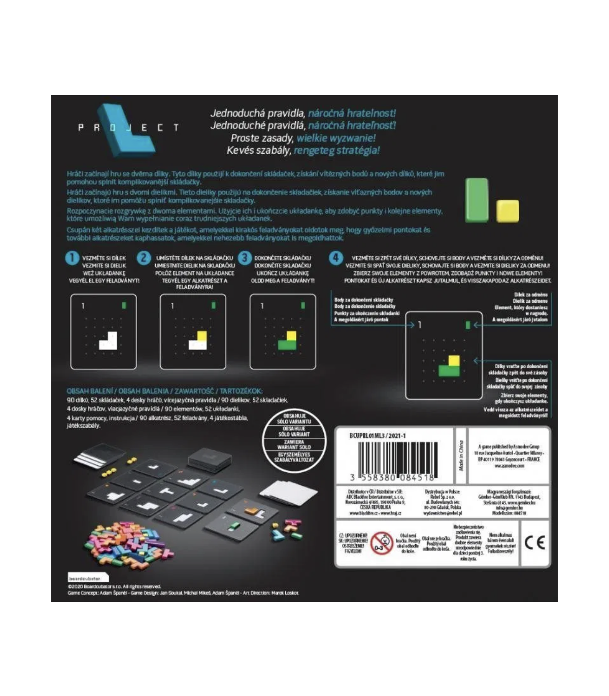 Project L je elegantní a návyková logická hra, která prověří vaši schopnost řešit prostorové úkoly a strategicky plánovat tahy. Tato elegantní logická hra, ve které hráči skládají tvary pomocí různých dílků, je nejen zábavná, ale také stimuluje mysl a udržuje ji aktivní. Díky jednoduchým pravidlům je snadno přístupná i pro starší hráče, kteří ocení její klidné tempo a přehledný design.