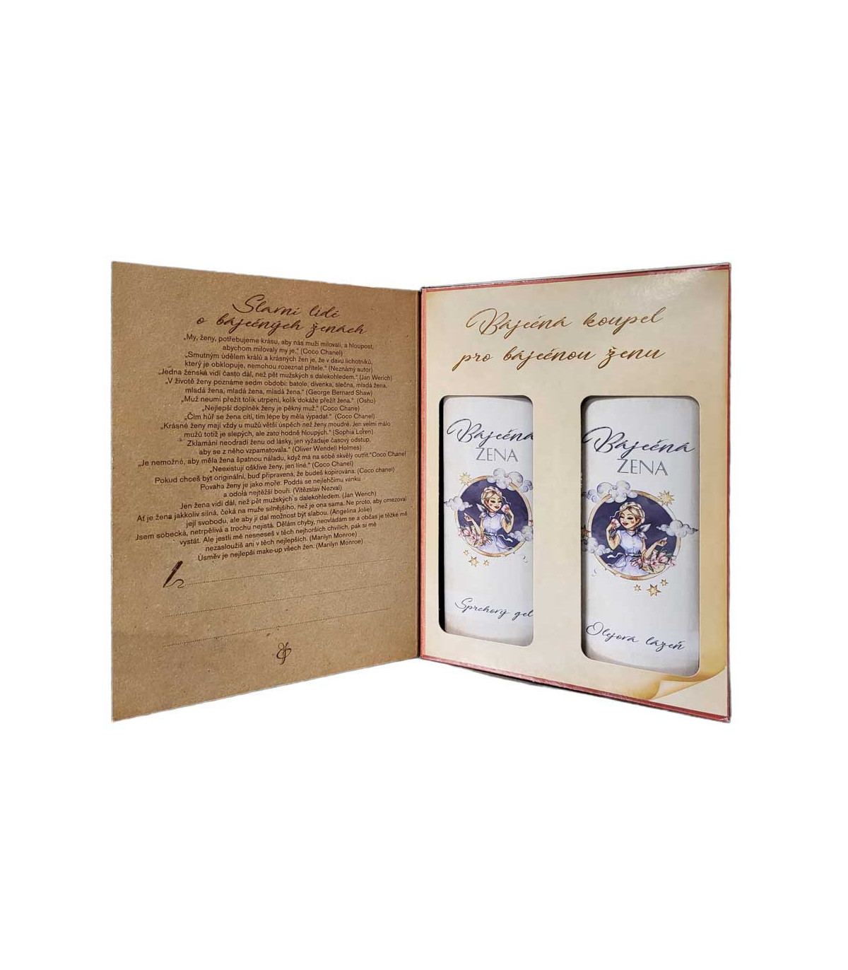 Přemýšlíte, jak potěšit maminku nebo babičku, protože je to ta nejbáječnější žena na světě? Pro báječné ženy máme dárkovou knihu Báječná žena. Překvapení bude o to větší, že uvnitř knihy se ukrývá sprchový gel a olejová lázeň pro chvilky pohody a relaxace. A protože se jedná o knihu, pár řádků o ženách si lze přečíst hned po otevření. Zkrátka kniha a dárková sada s kosmetikou v jednom pro všechny báječné ženy k jakékoliv příležitosti.