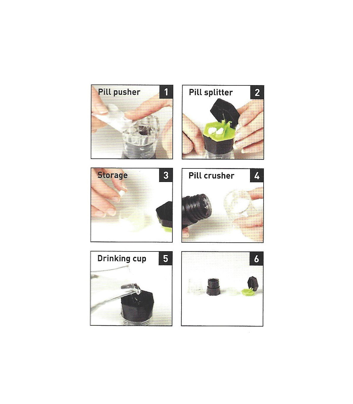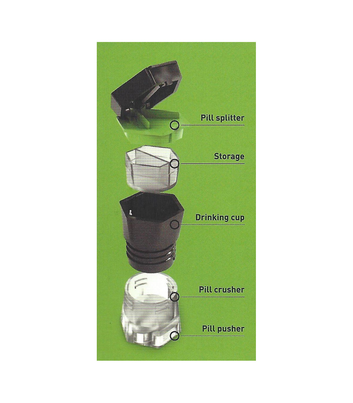 Šikovný pomocník s pěti funkcemi, které ulehčují podávání léků. Unikátní technologie spojující vytlačovač, půlič a drtič tablet v jednom. Společně s malým kalíškem na vodu a krabičkou na léky ulehčí nejen každodenní podávání léků, ale i cestování. Pomocník je vhodný nejen pro babičku nebo dědečka, ale také pro každého, kdo pravidelně užívá léky.
