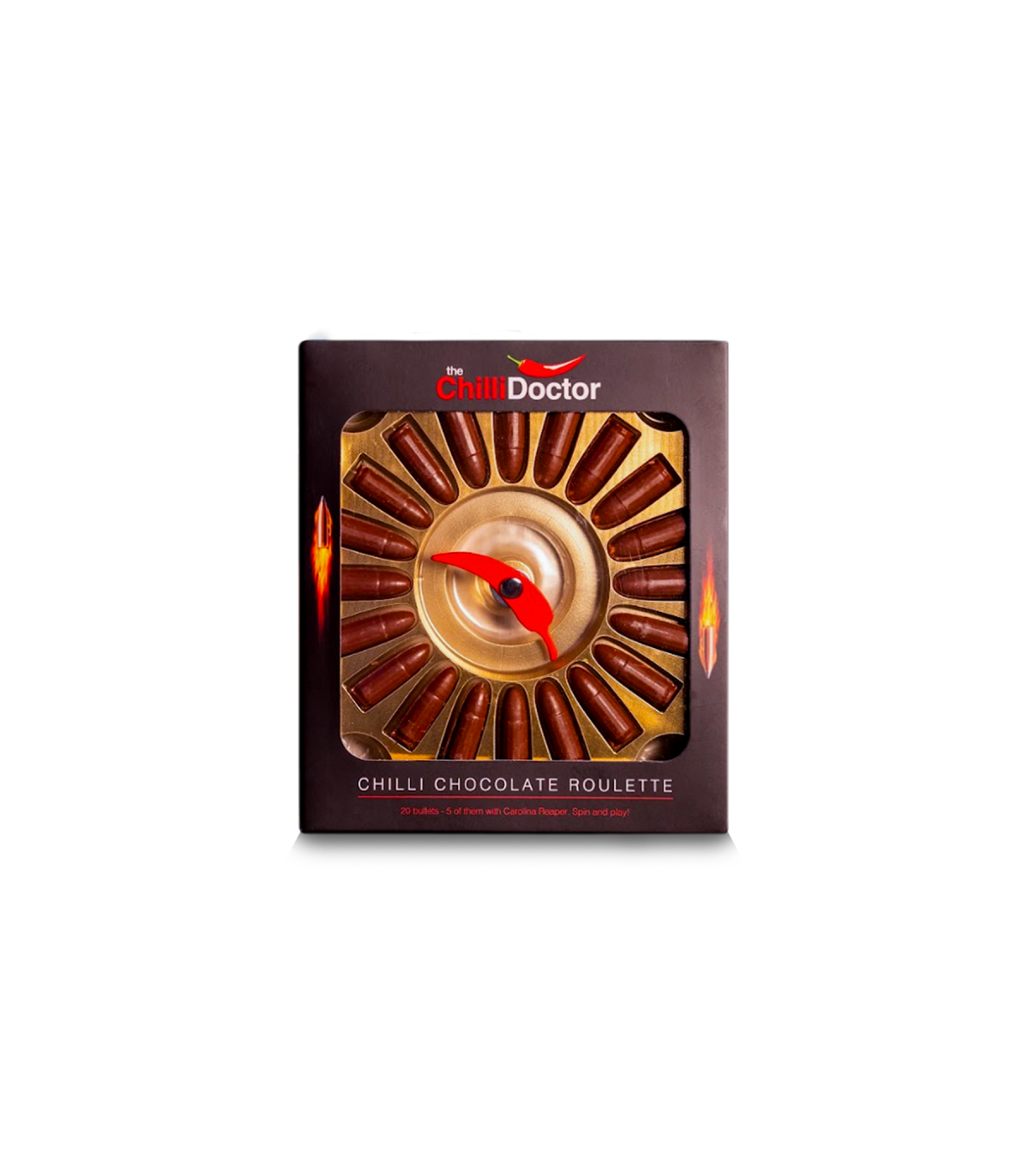20 čokoládových nábojů, 5 z nich obsahuje Carolina Reaper chilli