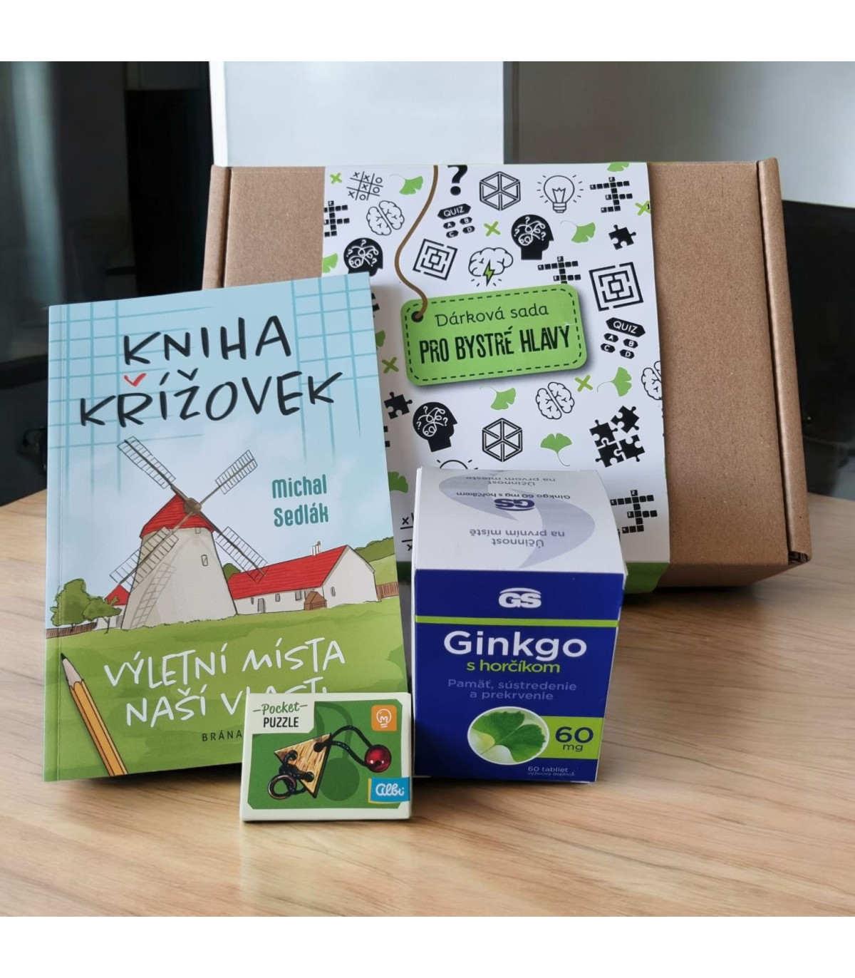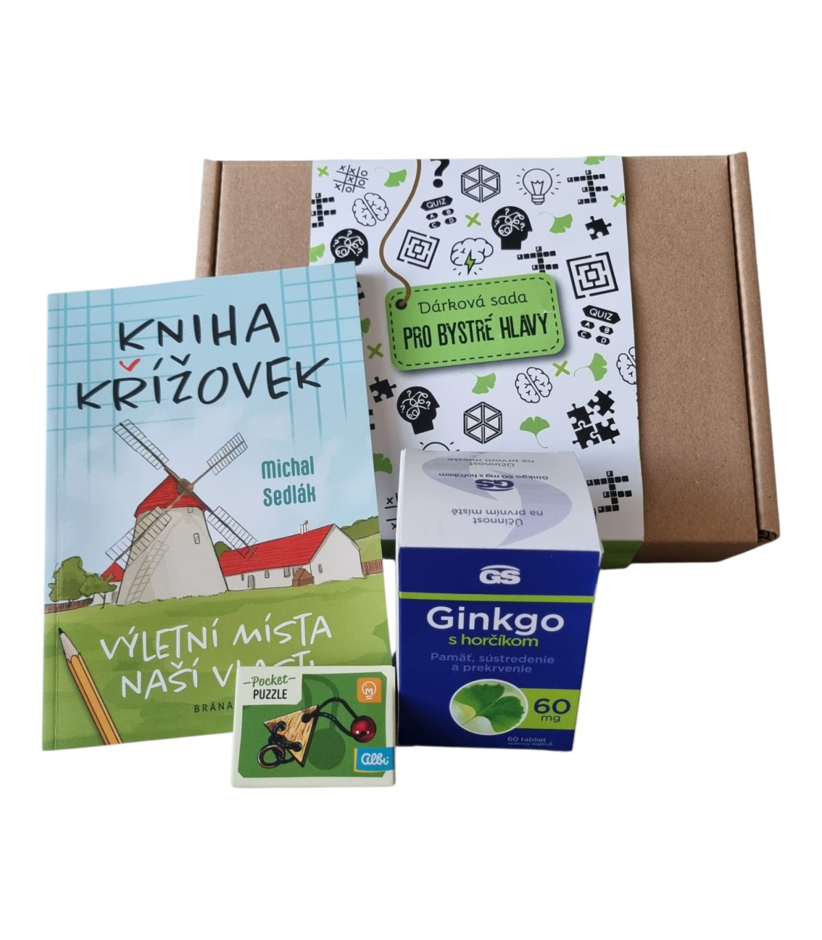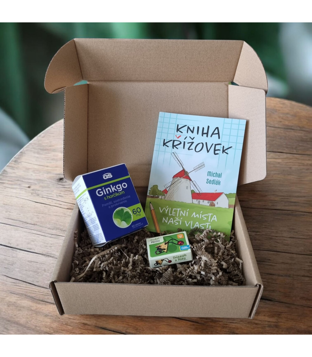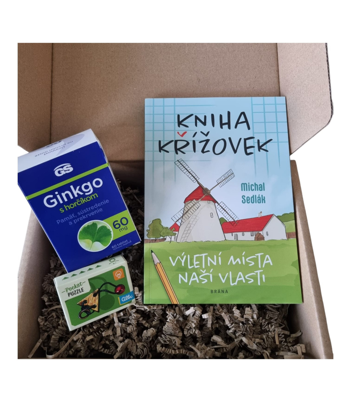 Potěšte svoji babičku nebo dědečka dárkovou sadou pro bystrou hlavu zabalenou v dárkové krabičce s tématickým obalem. Tato sada obsahuje křížovky, hlavolam a doplněk stravy Gingko obohacený o hořčík. Nejen, že jim uděláte radost něčím, co je baví, ale navíc uděláte i něco pro jejich zdraví. Díky křížovkám a hlavolamu si procvičí paměť a soustředění a díky Gingko a hořčíku budou méně unavení a vyčerpaní a jejich psychické zdraví bude v lepším stavu.