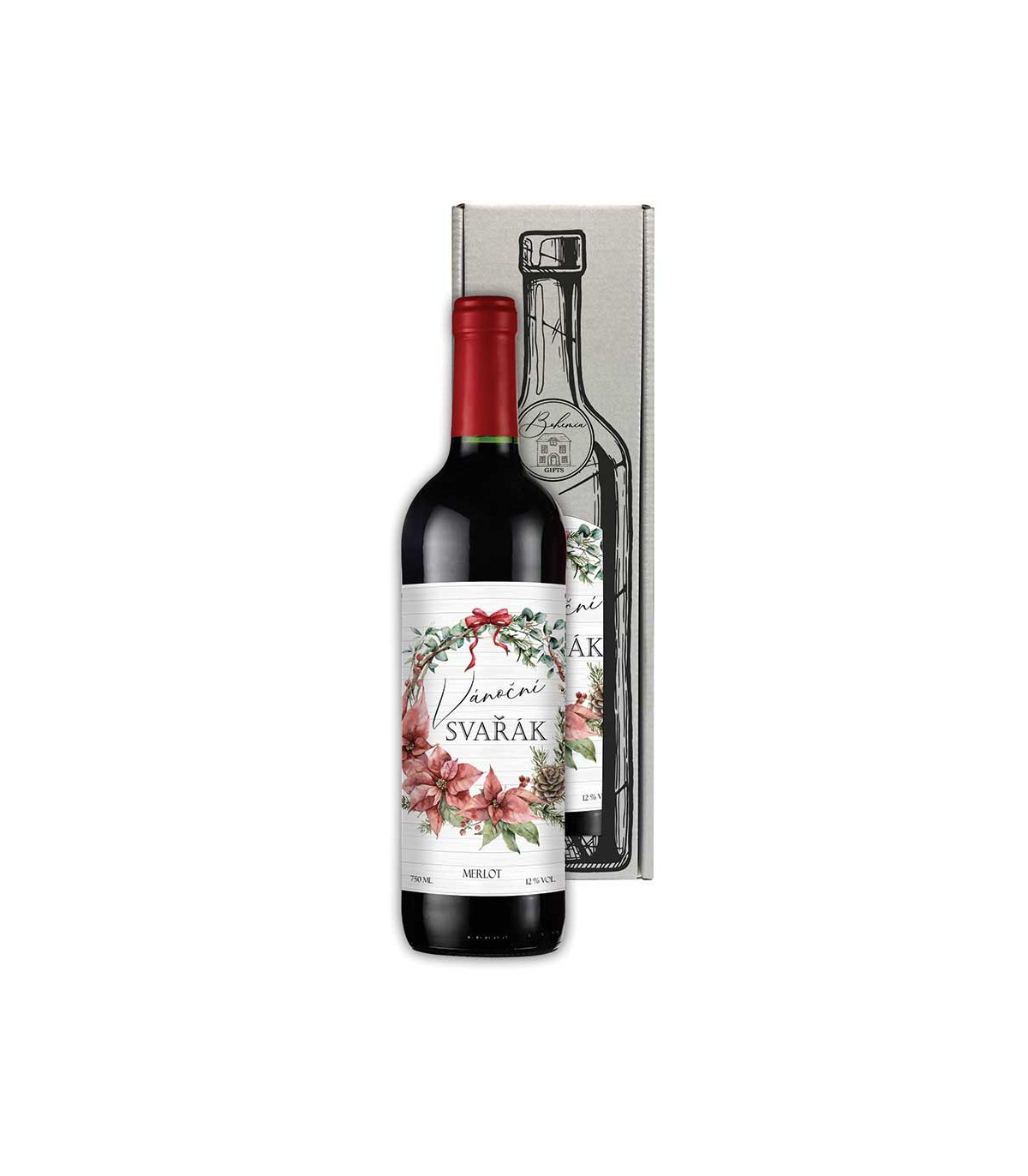 V dárkové krabici naleznete červené víno Merlot a sáček s kořením pro přípravu svařáku.